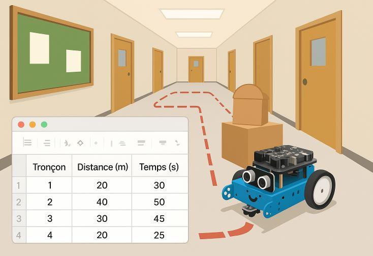 Le mBot réalise un trajet spécifique dans le collège.Dans le tableau ci dessous tu trouveras les distances parcourues par le mBot ainsi que le temps pour effectuer chaque tronçon :🖥️ Travail à faire :