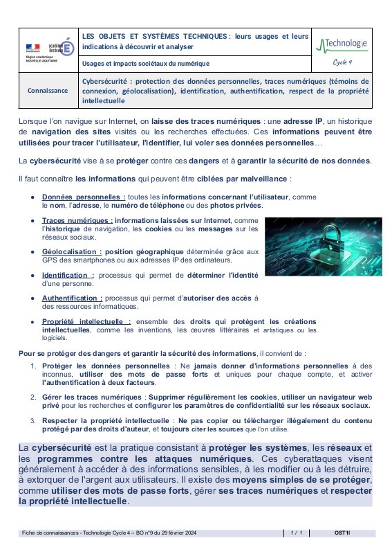 Selon toi, 1. En quoi la protection de nos données personnelles est-elle importante pour notre vie quotidienne et notre identité numérique ? 2. Quelles solutions vous semblent les plus efficaces pour s’en protéger ? … | Fiches connaissances (à télécharger dans l'onglet LES OBJETS ET SYSTEMES TECHNIQUES)