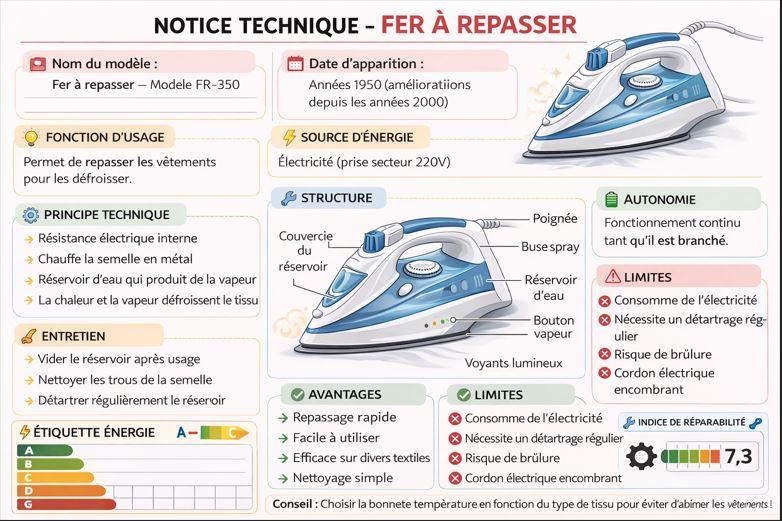 Choisis un objet technique que tu utilises régulièrement (exemples : brosse à dents électrique, trottinette, lampe de bureau, console de jeu, montre connectée…). À partir de tes observations et de ce que tu sais, complète la fiche ci-dessous comme une notice technique simplifiée.
