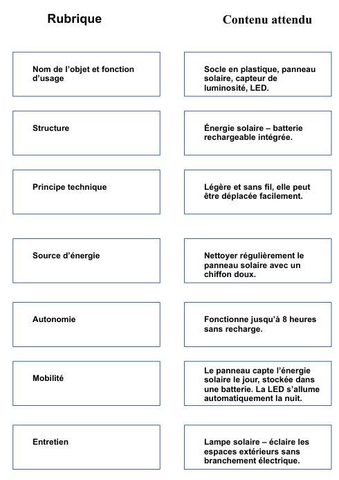 La notice technique d'une lampe solaire a été découpée en plusieurs morceaux. À toi de retrouver l’ordre logique des rubriques et de les associer à leur rôle.